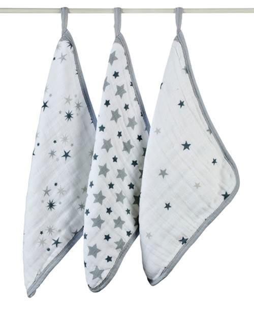 Made from 100% cotton muslin. These durable four-layer washcloths are extremely gentle on delicate baby skin, getting softer with each wash. The generous size of each washcloth makes bathing quick, and easy. The attached loop lets you hang the cloth to dry to avoid wet tub-side heaps. These long-lasting and stylish bath time accessories will be the only washcloths you will need right through to the toddler years.