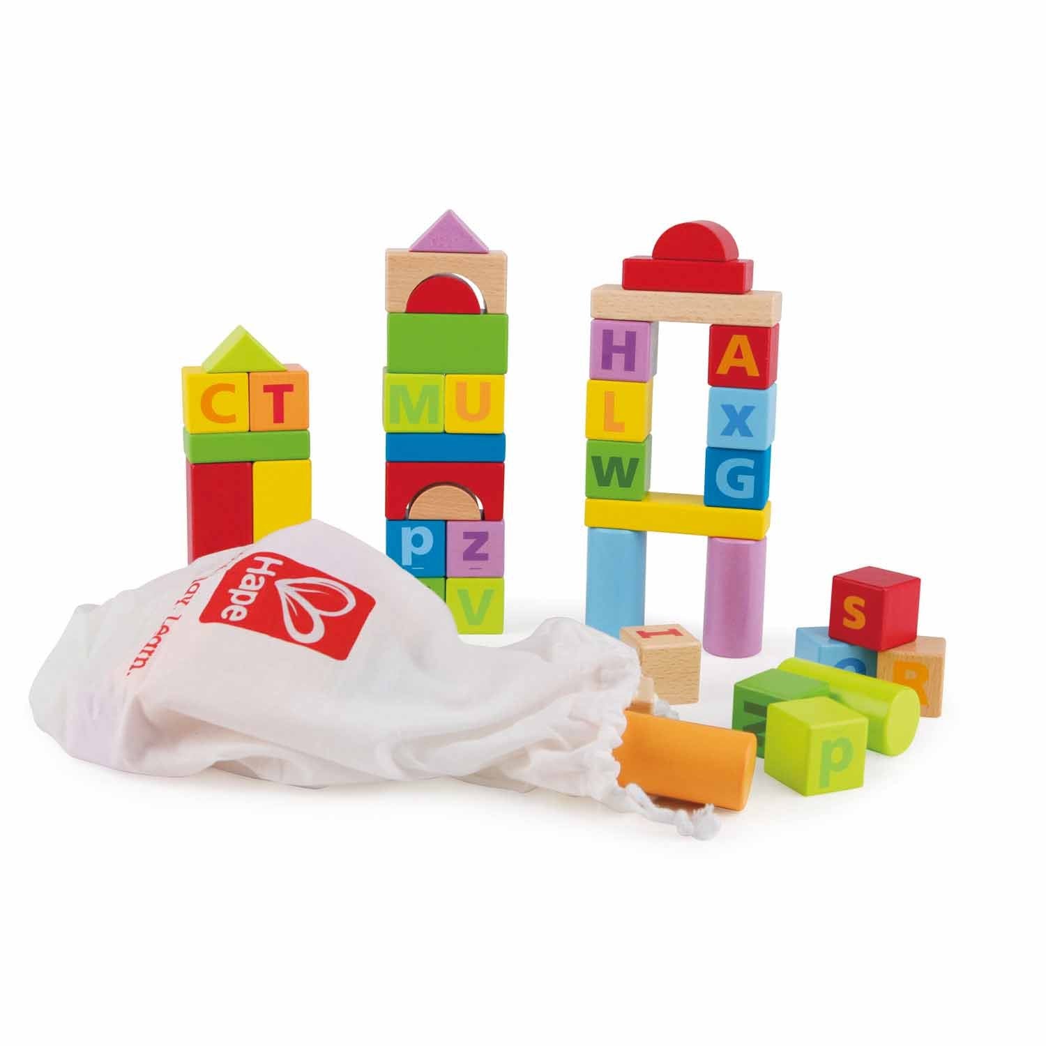 Hape's 60 piece Build N Spell Block Set, stacks up for funny building structure as well as building words. Explore how different shapes can make towers higher or wider. How high can you build without toppling over?Build a house and tell stories about who lives there.