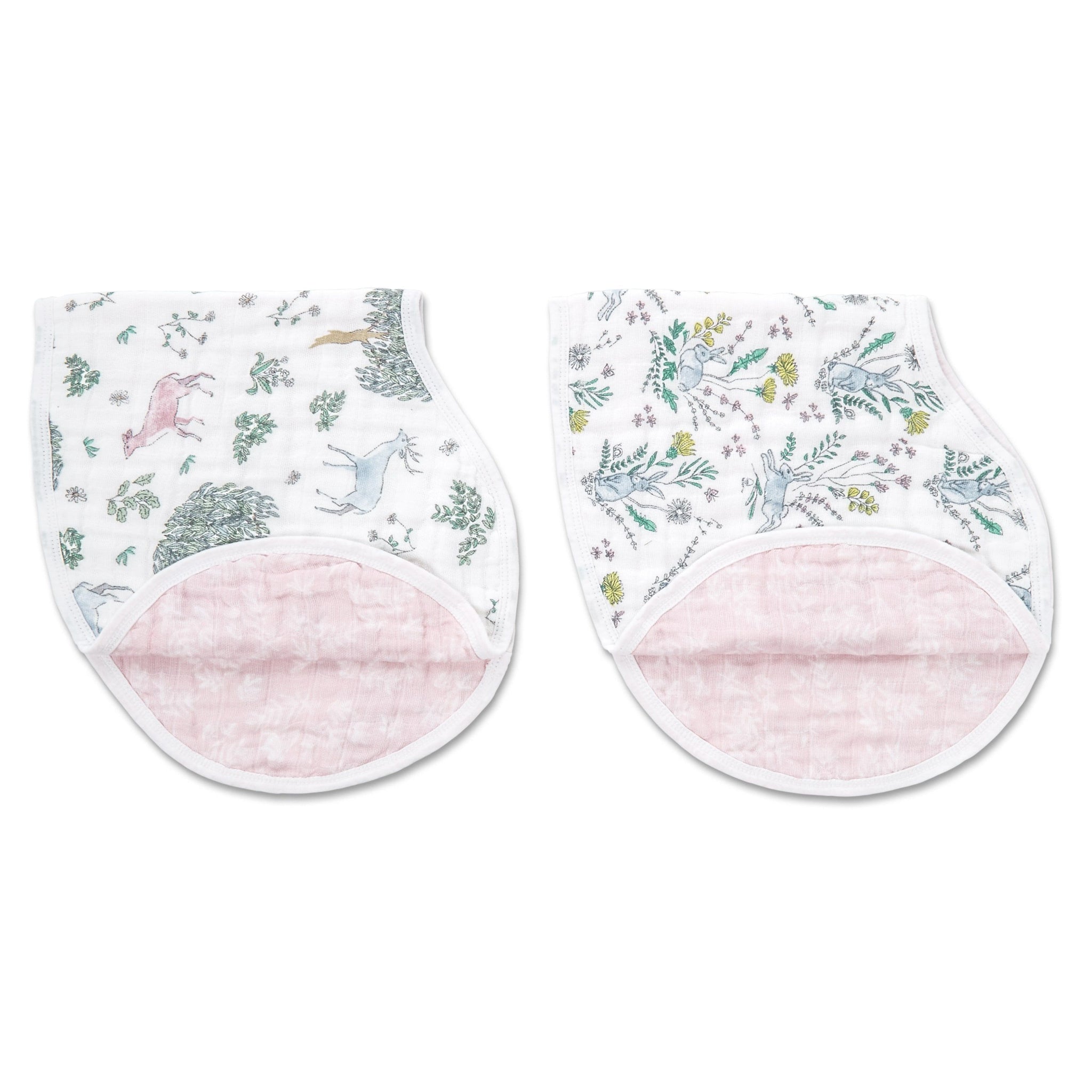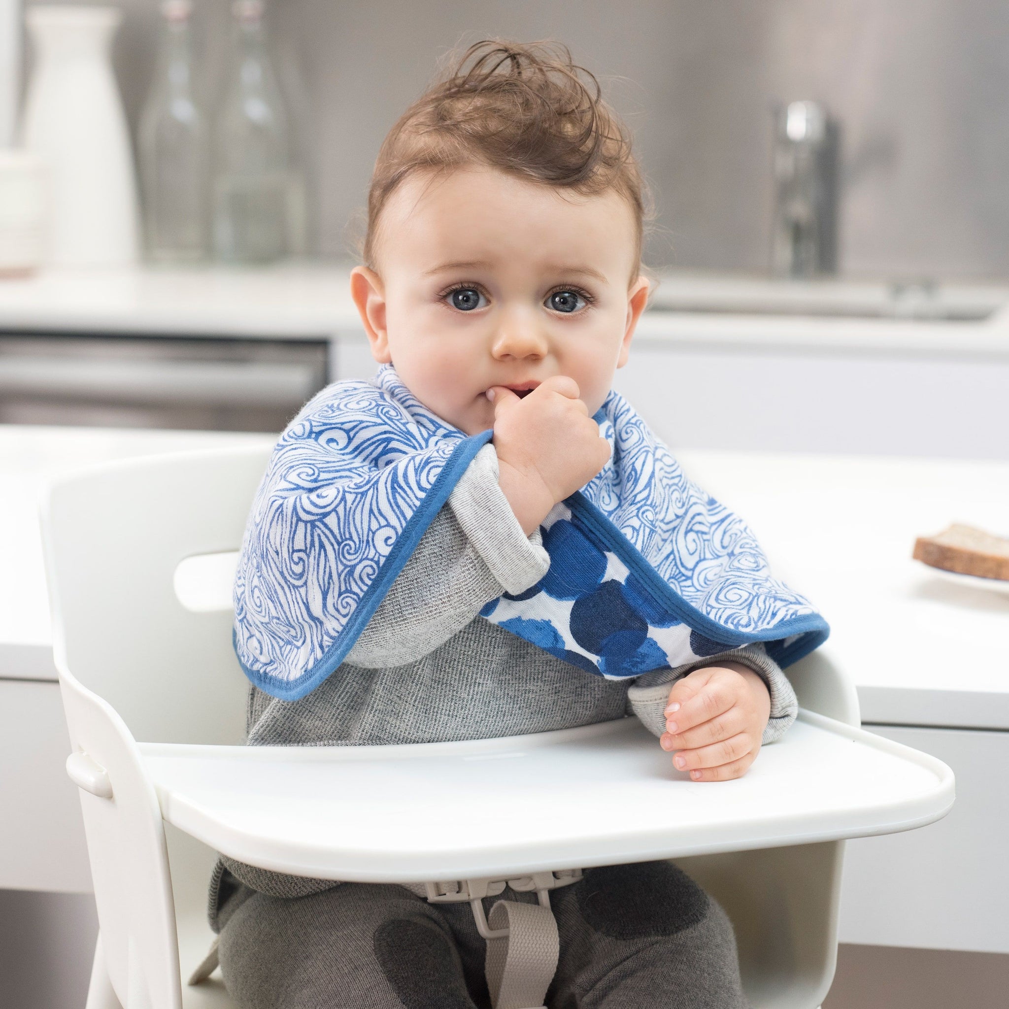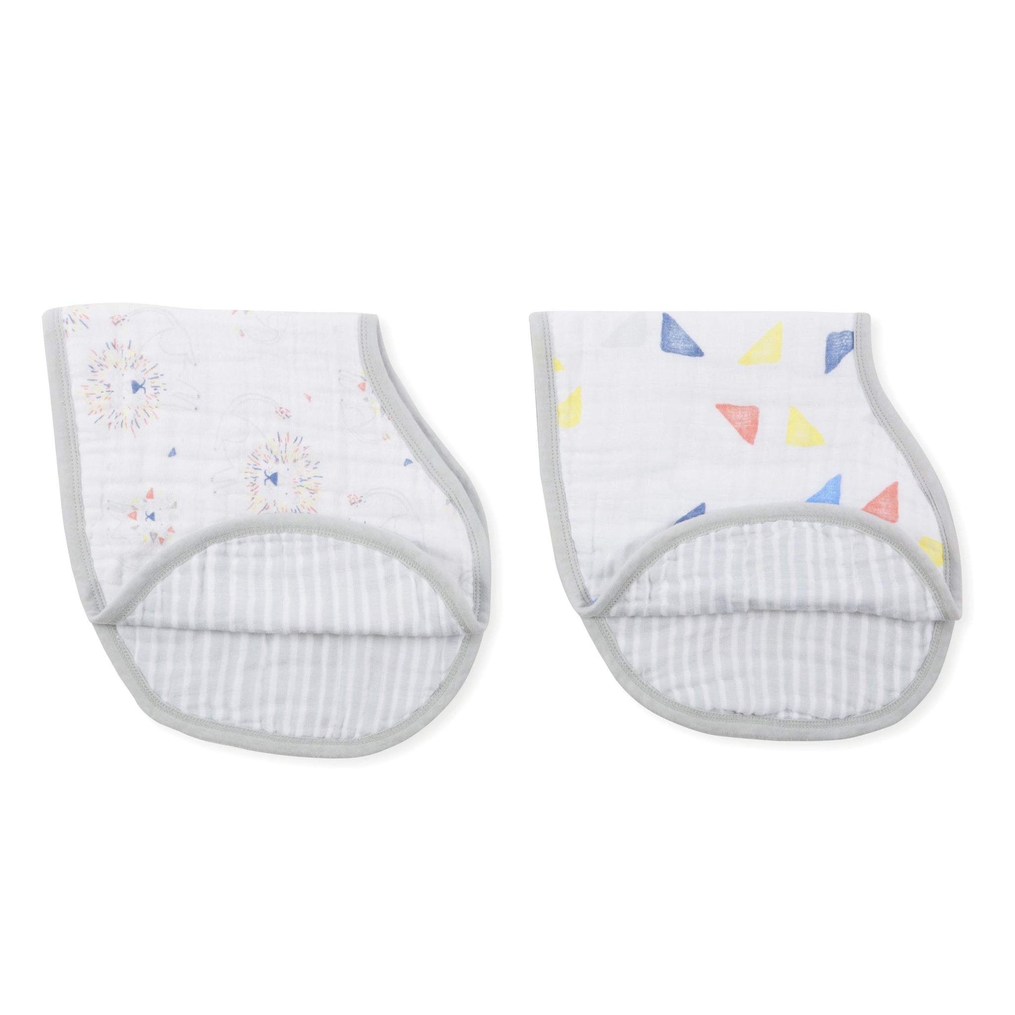 aden + anais Classic Burpy Bibs are made from four layers of soft and absorbent 100% cotton. The semi-circular shape allows the bibs to double as burp cloths, too. As a burp cloth, Burpy Bibs surround the shoulder providing good protection. As a bib it covers your little one's shoulders and arms, draped around their neck with a snap in the back. The bibs clean easily and dry exceptionally quick. The 2-sided design keeps even those burp messes looking... OK, nothing makes that look pretty, but, they are darn cute!