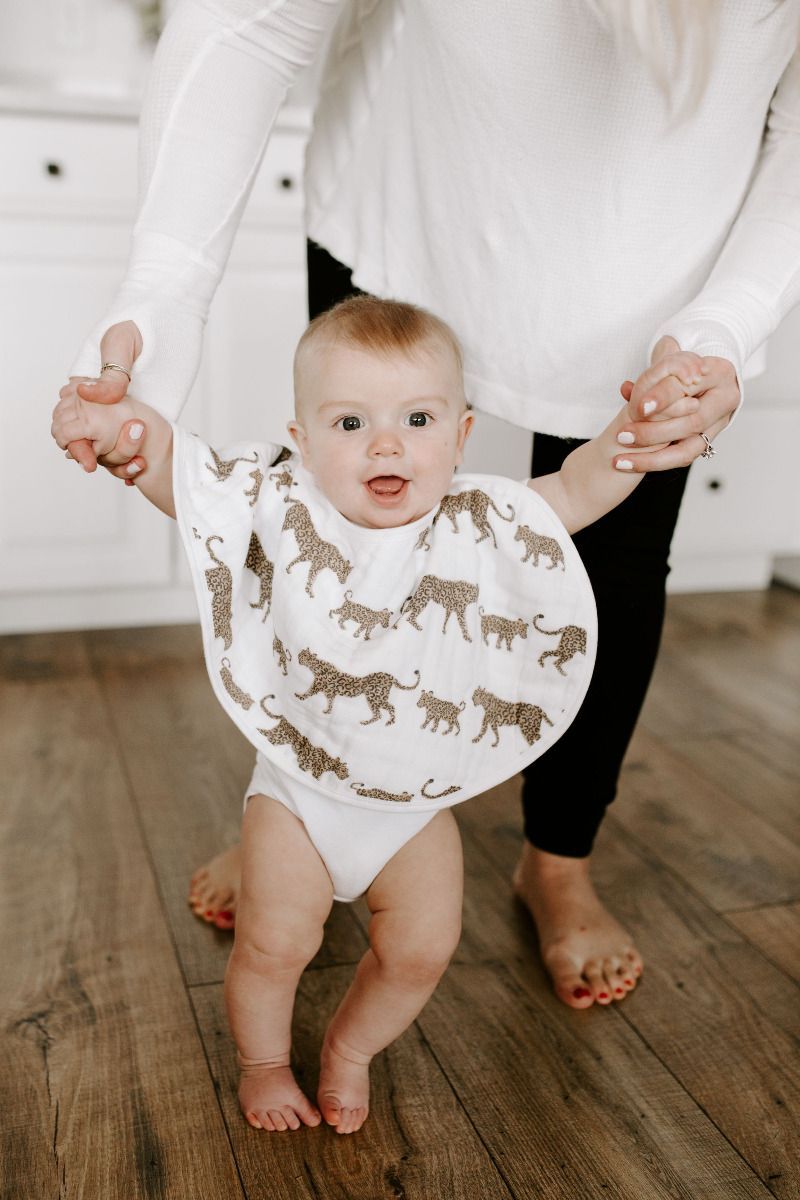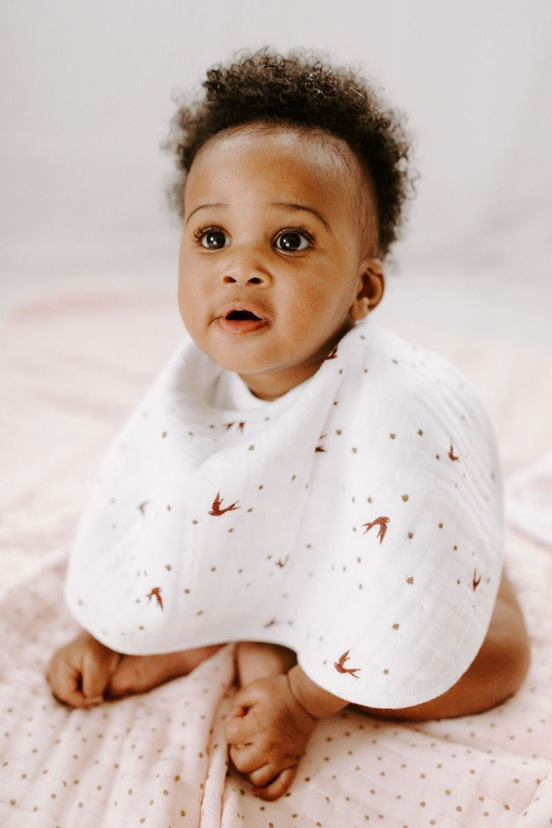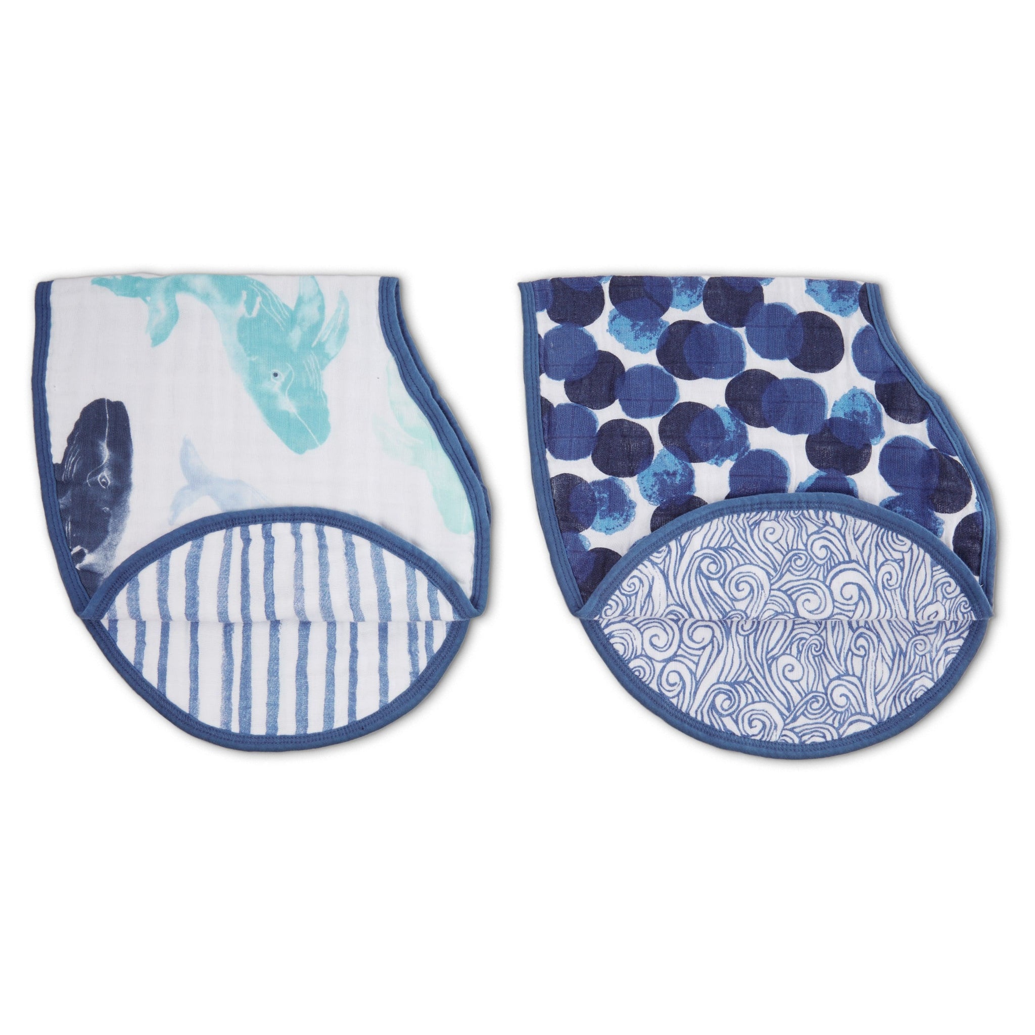 aden + anais Classic Burpy Bibs are made from four layers of soft and absorbent 100% cotton. The semi-circular shape allows the bibs to double as burp cloths, too. As a burp cloth, Burpy Bibs surround the shoulder providing good protection. As a bib it covers your little one's shoulders and arms, draped around their neck with a snap in the back. The bibs clean easily and dry exceptionally quick. The 2-sided design keeps even those burp messes looking... OK, nothing makes that look pretty, but, they are darn cute!