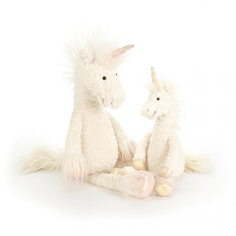 Galloping in on a shimmering breeze, it's Dainty Unicorn! Soft, scruffly and full of spells, he's a magical friend for any boy or girl. His pearly pink hooves match that magical horn, and we love his soft, wispy mane, tail and feathers. A glimmering gift for birthdays or any days - life is more fun with a unicorn pal! (*Please do note that only the Medium size of Dainty Unicorn has fur trimmed hooves)