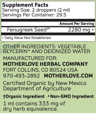 Motherlove's Fenugreek is a single herb breastfeeding supplement in an alcohol-free liquid tincture. Nursing and pumping mothers can benefit from this effective herb in a 2 ounce tincture that will last approximately 10-14 days, depending on your body weight.