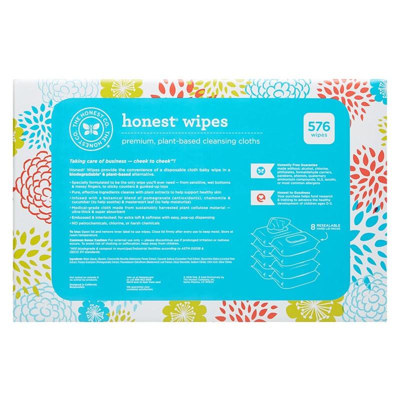 Honest Wipes Bulk 8 pack box of 72 count Baby Wipes for a total of 576 wipes, big savings in time and money! Honest Company all natural wipes are thick and absorbent. Made from strong and soft medical-grade cloth, this wipe can do it all. The gentle, yet effective ingredients cleanse and soothe with plant extracts that promote healthy skin. Infused with a botanical blend of pomegranate (antioxidants), chamomile & cucumber (to soothe), and masterwort leaf (to moisturize). They are perfect for wet bottoms, messy fingers, sticky counter tops and even gunked-up toys. We love their thickness and softness, and so will you.