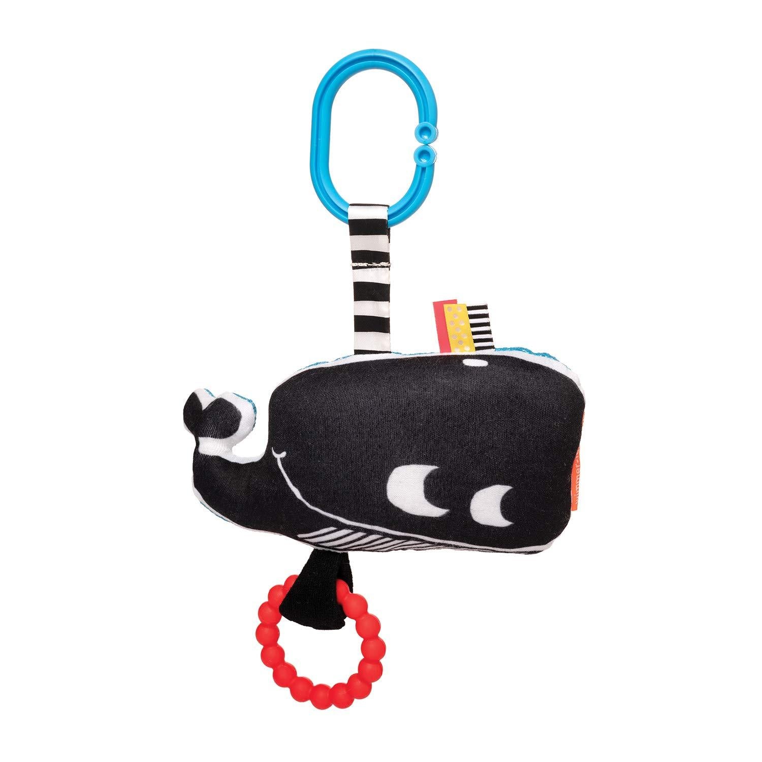 The Wimmer-Ferguson Travel Toy features black and white graphics, ribbons, bungee tail, chime and silicone teether that's removeable for washing. The travel toys in our Wimmer-Ferguson collection feature a C-clip for easy attachment to carriers or strollers so you can bring them on the go. Stimulate baby's visual development with the Travel Toy. Available in Tiger and Whale.