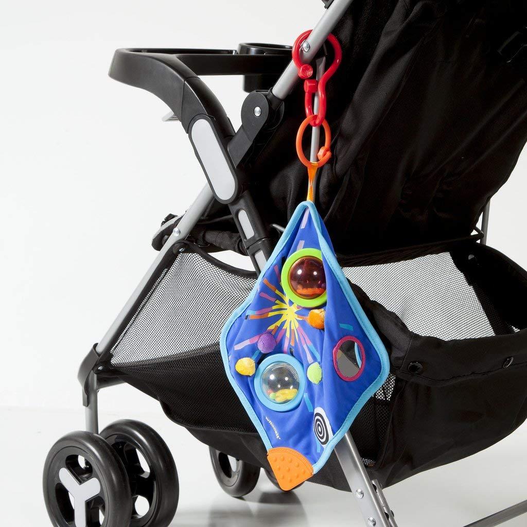 The Whoozit Space Blankie is full of bright colors with two spinning rattle balls, discovery mirror and teething corner. Features clip for attachment to strollers and carriers. Fosters development of fine motor skills and teaches cause and effect. Stretchy material for baby to grasp and pull.